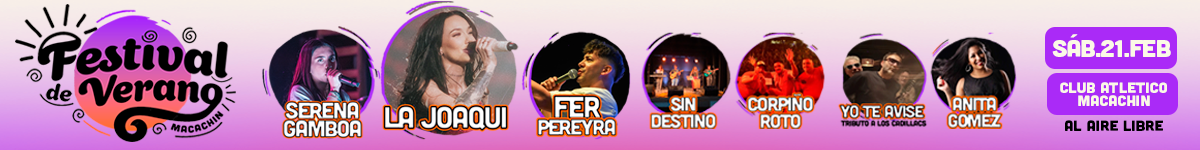 POR CUESTIONES CLIMÁTICAS, EL FESTIVAL DE VERANO EN MACACHÍN FUE REPROGRAMADO PARA EL 21 DE FEBRERO. LAS ENTRADAS ADQUIRIDAS SIGUEN SIENDO VÁLIDAS.